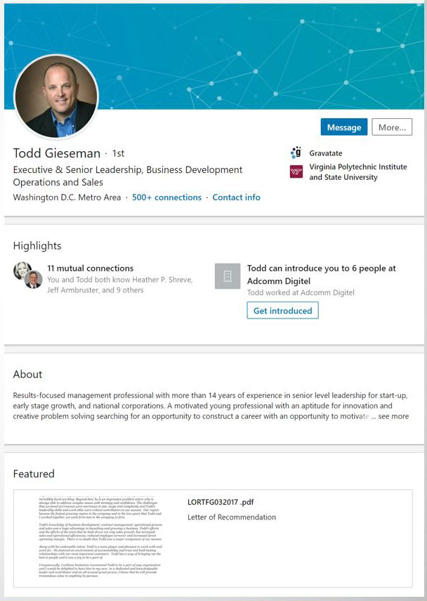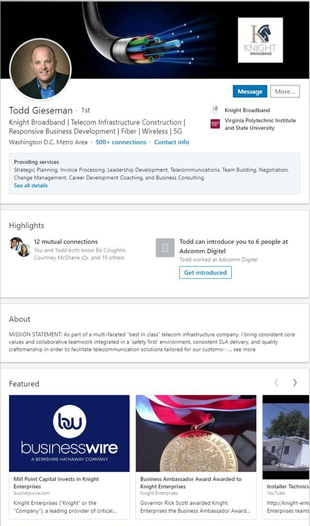 Many Business Development professionals use LinkedIn for prospecting. A clear, concise, professional profile will get responses. In addition, if you are a business owner or high-level executive, it is imperative your profile matches your position and portrays a company where people would clamor to work.