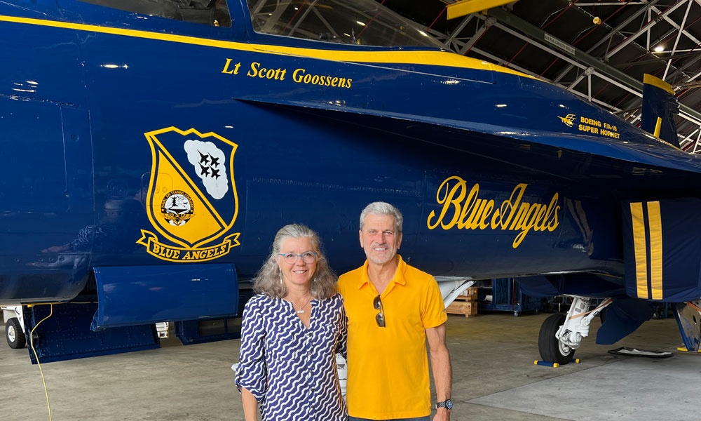 “My dad was a flight instructor who taught pilots how to fly using instruments. He was gifted an amazing photo of Blue Angel Rob Fields flying over the World Trade Centers in 2000 by Rob’s father, who he taught to fly. This photo always stuck in my memory,” said Jolie. “Getting to see these planes, pilots, and operations up close was an amazing experience for both Tom and I. We never imagined we could ever get that close.”